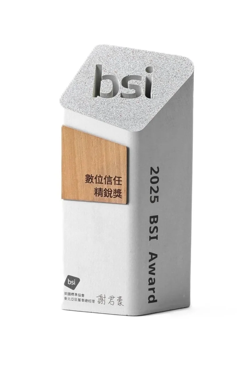 BSI 數位信任獎獎座藉由不同材質的結合,展現永續、韌性與創新的精神。 為響應淨零目標與減碳行動,獎座製作選用循環再利用材料,以回收建築廢材混合減碳水泥製成,不僅具現代質感,更象徵企業持續推動永續發展的承諾與影響力。